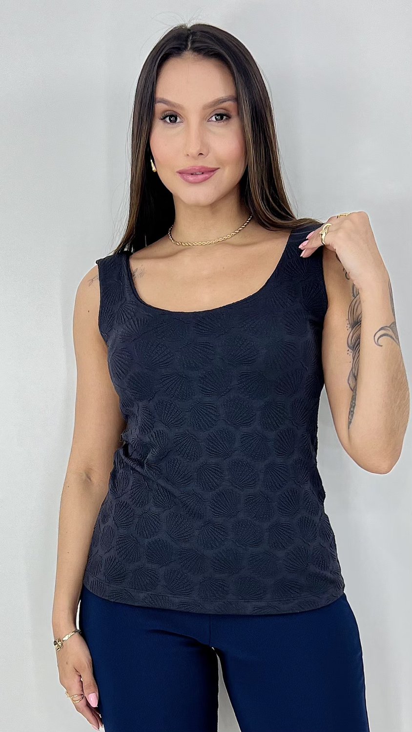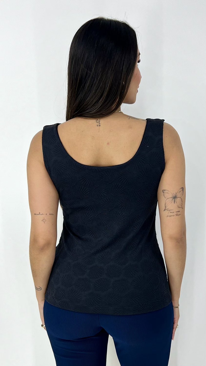 Item: Regata feminina lisa preta com bojo, detalhes em alto relevo de conchas na própria malha, alças mais largas.
