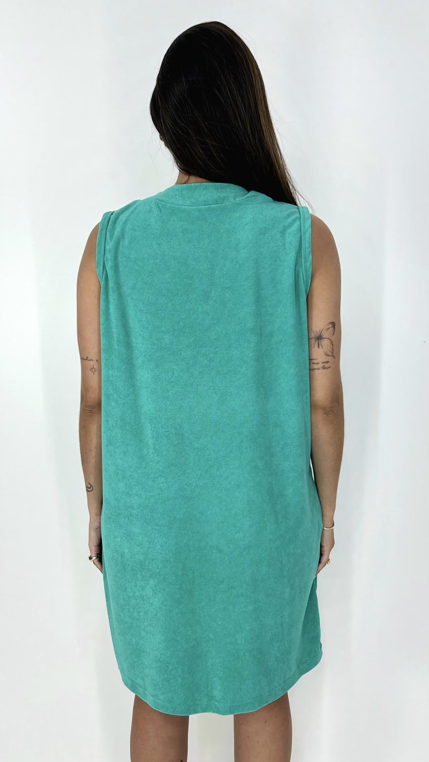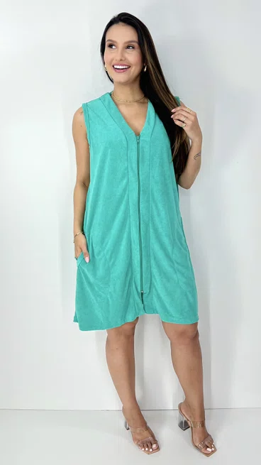 Item: Saída de Banho Roupão Lucia Liso Verde, em detalhe com fechamento em zíper.