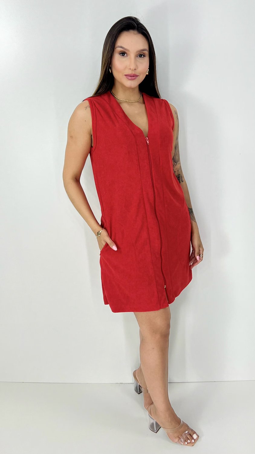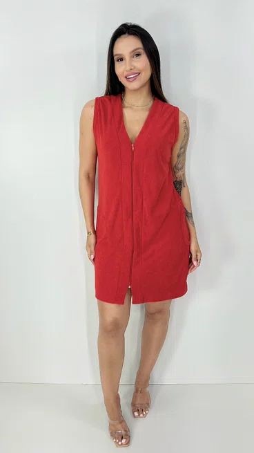 Item: Saída de Banho Roupão Lucia Liso Vermelho, em detalhe com fechamento em zíper.