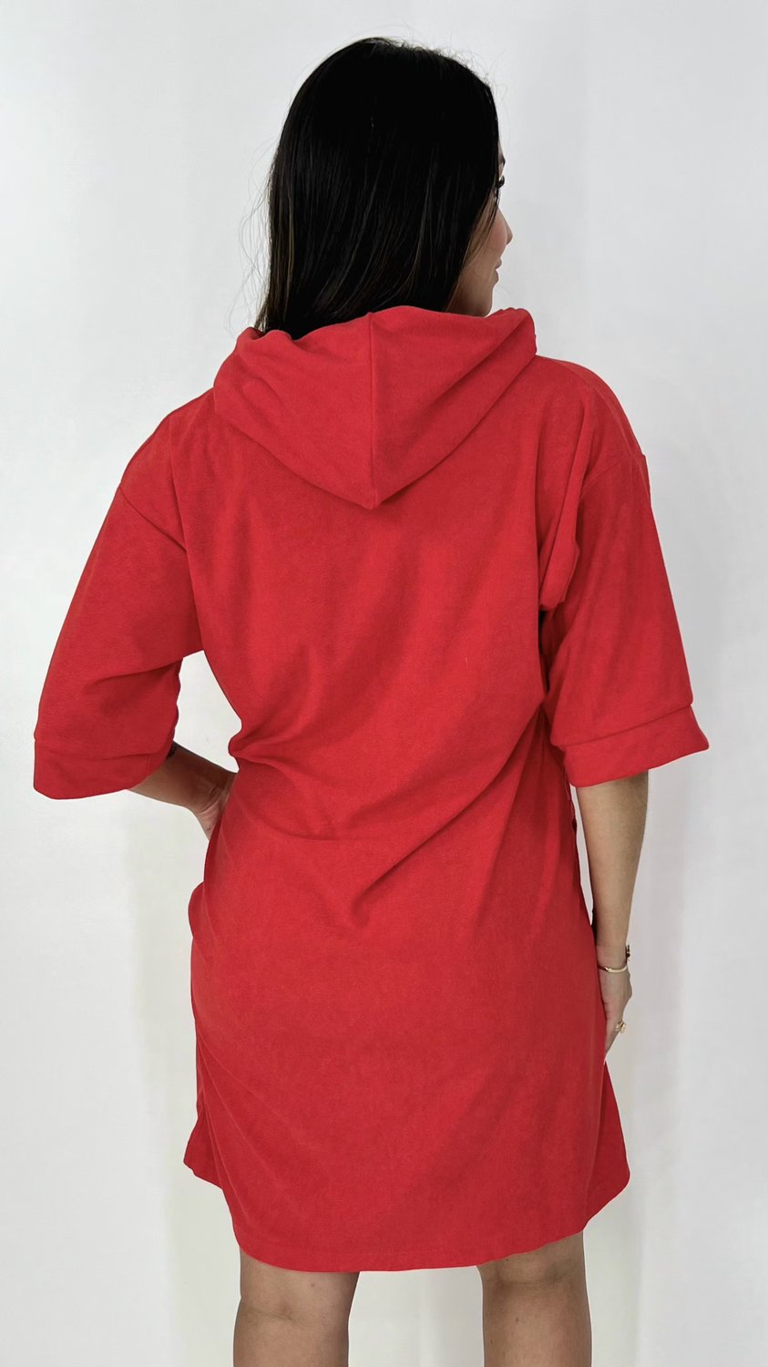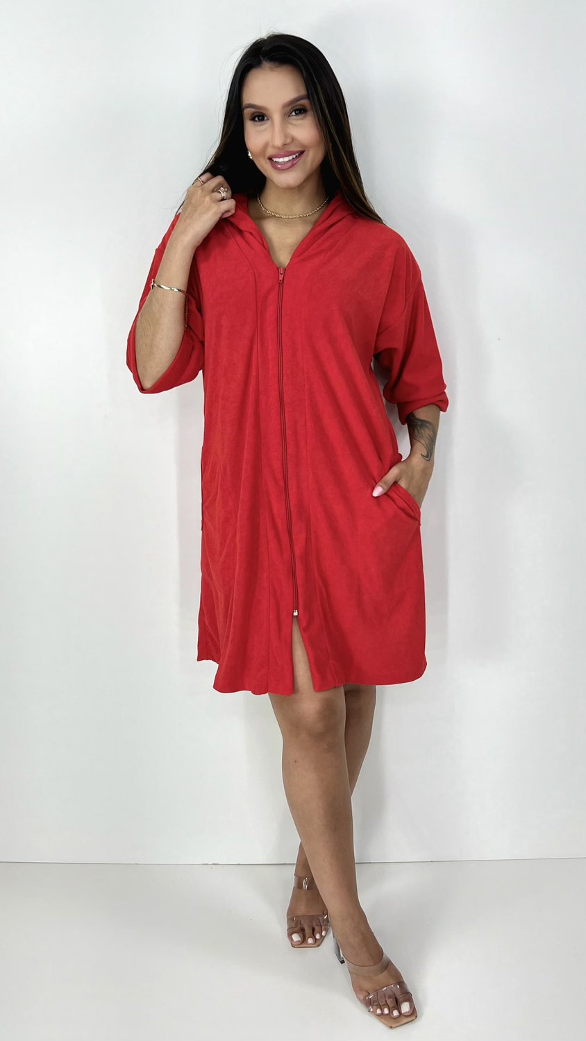 Item: Saída de Banho Roupão Sofia Liso Vermelho, em detalhes capuz e fechamento em zíper.