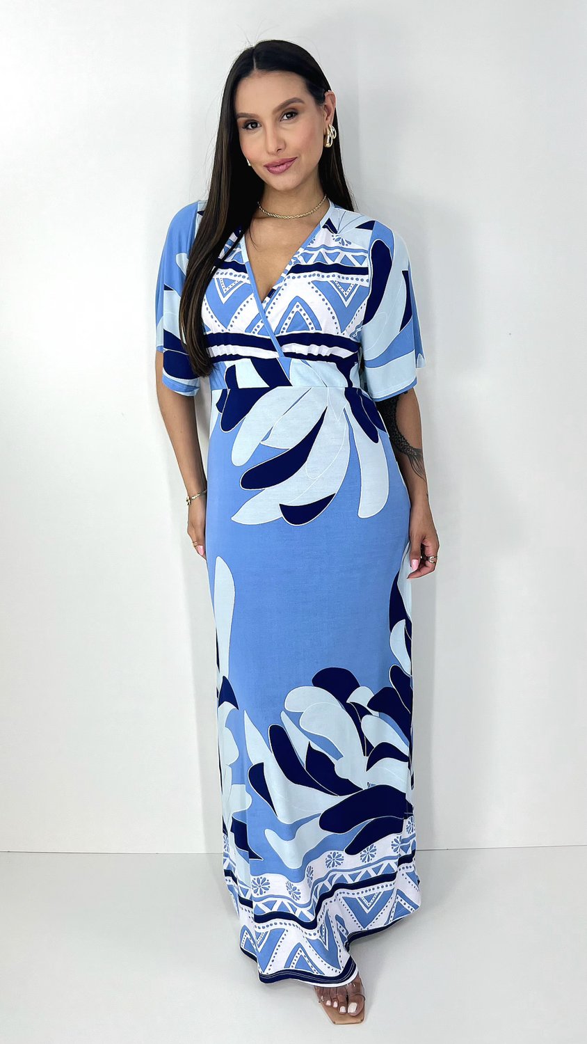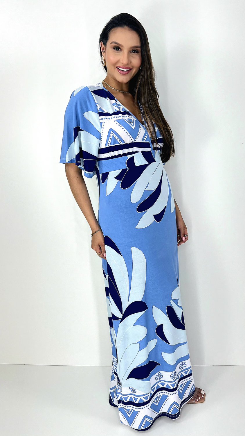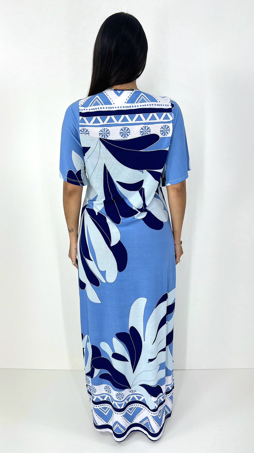 Item: Vestido feminino manga curta estampado em tons de azul, na modelagem Kaftan, mangas soltas, detalhe do decote transpassado e faixa embaixo do busto para dar mais sustentação e fendas laterais para dar movimento na peça. Vestido leve e fresco para os dias de verão.