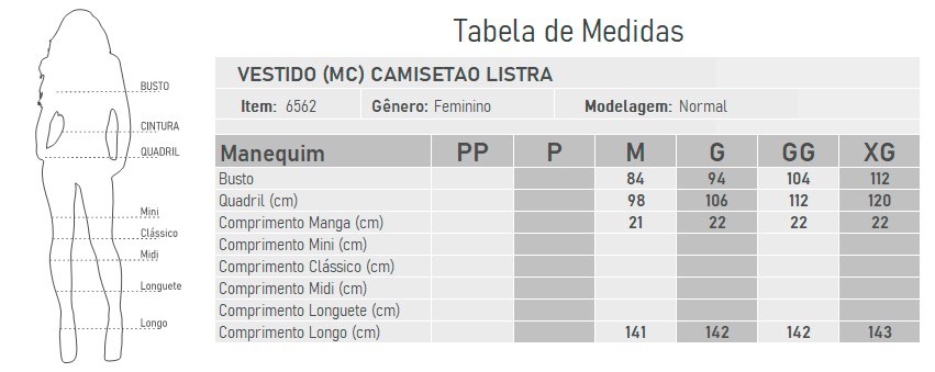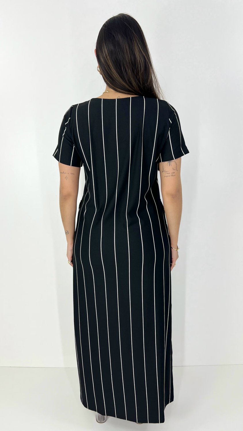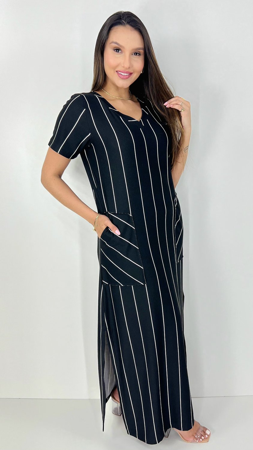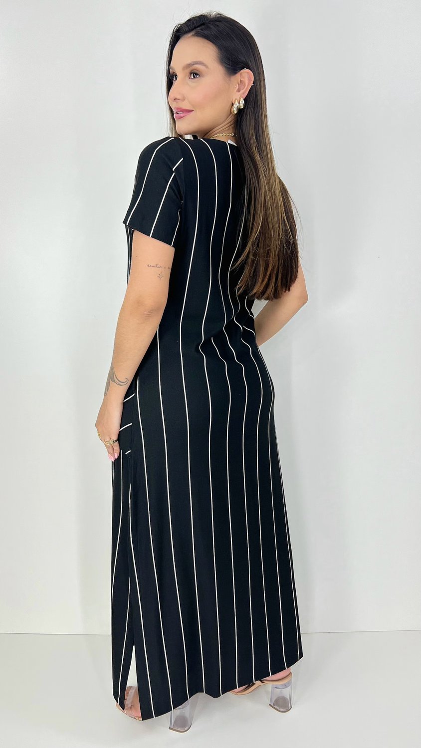 Vestido Feminino Longo Camisetão Manga Curta Listrado Preto e Branco