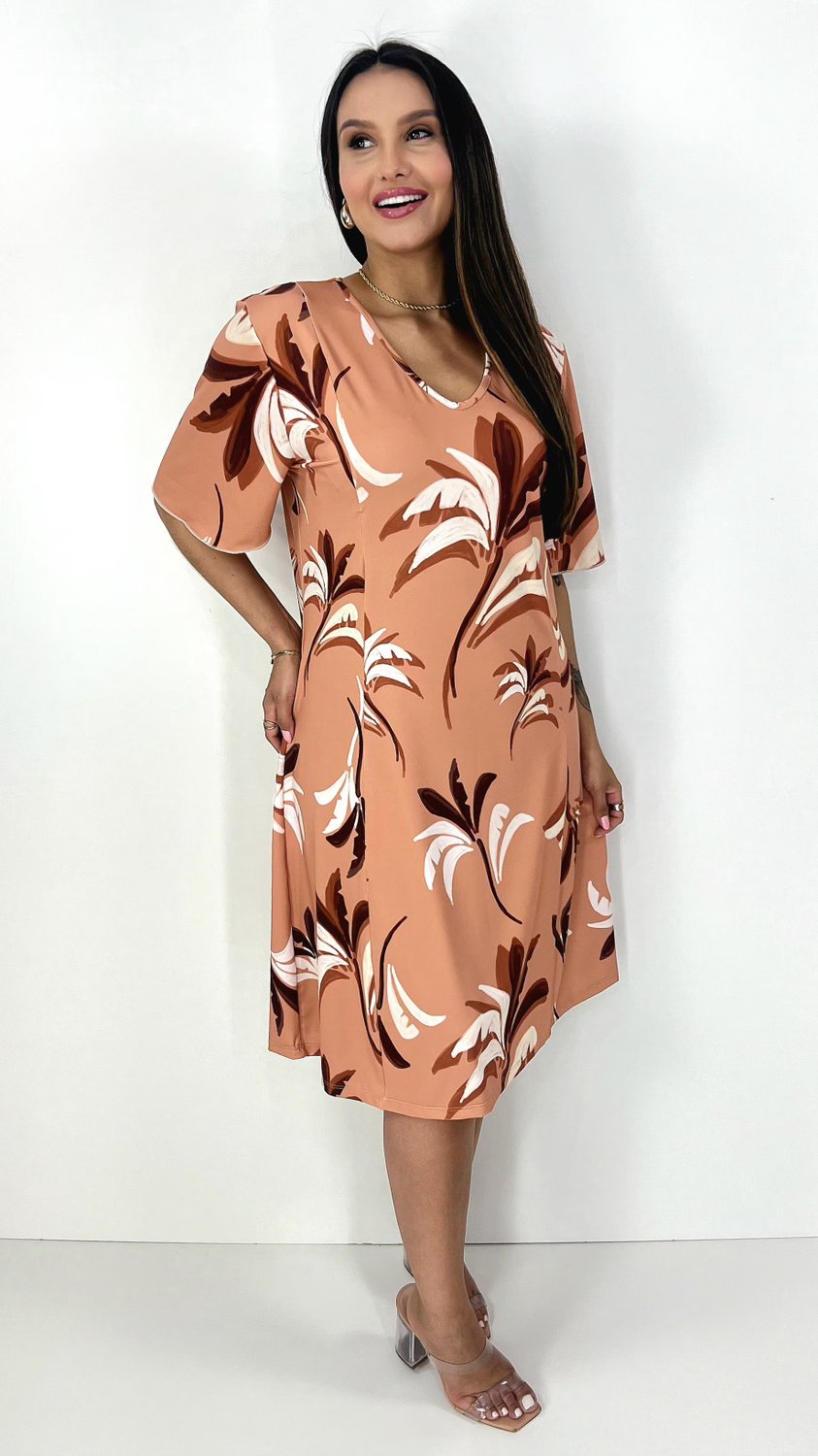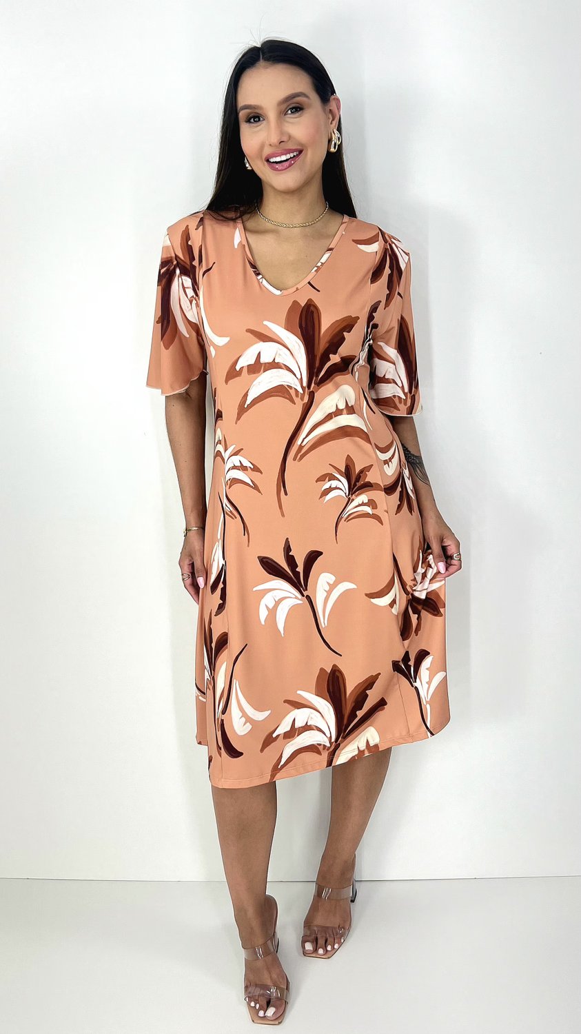 Item: Vestido feminino manga curta estampado em tons terrosos, modelagem mais solta, com bastante elastano, mangas soltas, decote em V e costura frontal para dar movimento. Modelo feito para quem procura um vestido confrotável e solto para o verão.