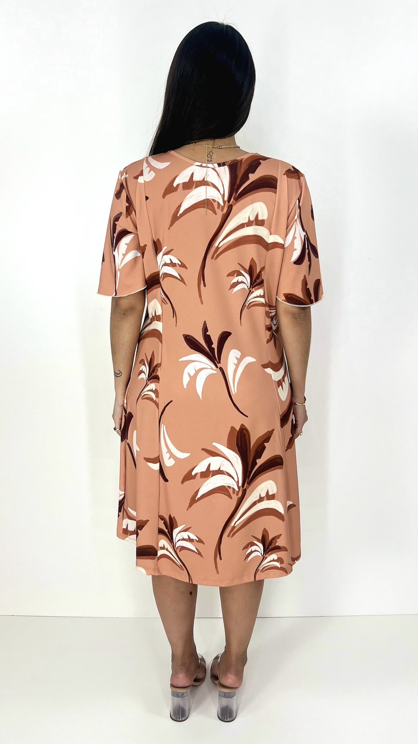 Vestido Feminino Manga Curta Estampado em Tons de Marrom
